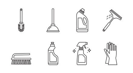 Black outline vector icons of various cleaning tools, including a toilet brush, plunger, squeegee, and gloves, emphasizing cleanliness and hygiene.