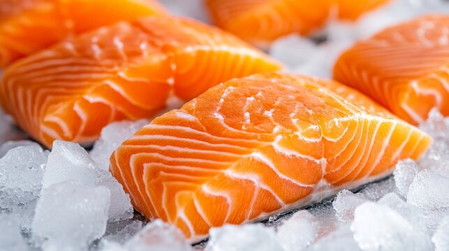 Close up of salmon fillets with their bright orange hue resting on crushed ice in a traditional fish market chilled freshness emphasized