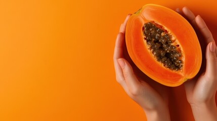 A pair of hands holds a freshly cut papaya, emphasizing its vibrant orange color and juicy interior, symbolizing health and the joys of fresh fruit.