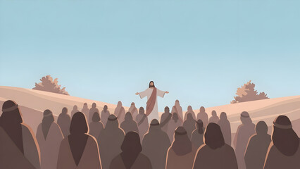 A watercolor scene of the Sermon on the Mount, with soft pastel colors blending into the background, emphasizing Jesus gentle teaching presence.