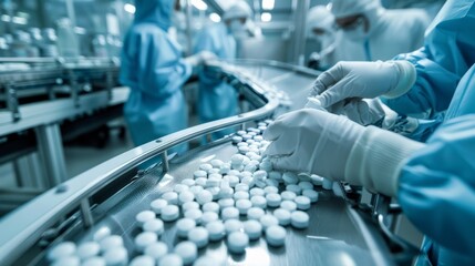 Workers in full protective gear sorting and packaging pills on a state-of-the-art pharmaceutical production line, emphasizing the precision and hygiene in modern medication manufacturing processes.