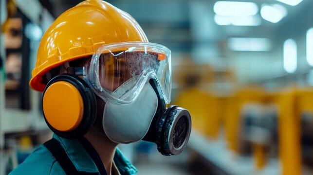 Workers in protective masks and helmets inside a factory, emphasizing safety protocols