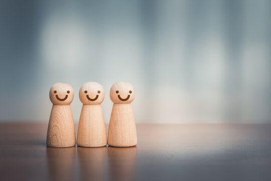 Wooden people with smiley faces on table. Concept of teamwork, leadership, HR, employee satisfaction, business management, and positive workplace culture.