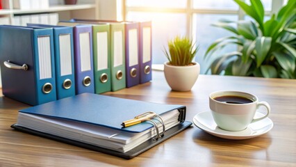 A binder with a company's employee handbook and policy documents lies open on a desk, surrounded by office supplies and a cup of coffee.