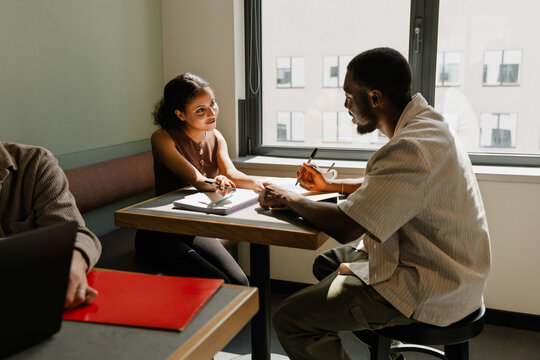 A female employee smiles and listens to a male employee talking while they hold pens and sit across from each other at a table