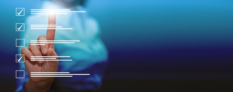 Survey form, check marks on checklist, filling online form and answering questions concept background. Banner. Copy space.