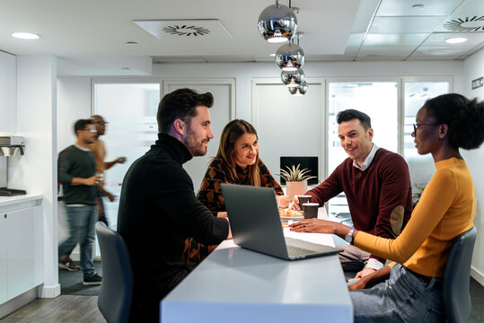 A diverse group of business coworkers is actively brainstorming a project together. The modern office setting adds a dynamic vibe to their collaboration, emphasizing teamwork and creativity.