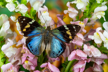 USA, Washington State, Sammamish. Tropical butterfly on pink and white snapdragons