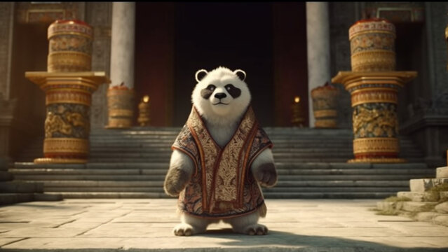 Chinese panda warrior Emporer walking down the stairs of the palace. Cool animal photos. Chinese oriental fantasy. AI art.
