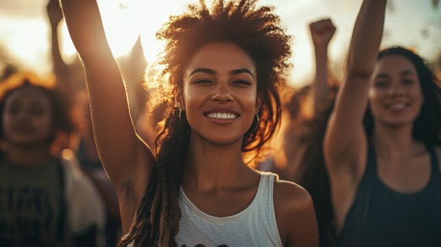 Vibrant blonde within diverse women group, exhibiting unity in diversity and stand against racial inequality on multicolor gradient backdrop. Generative AI