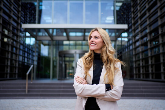 Modern stylish Caucasian adult business woman dressed in formal suit standing in work place outdoor. Strong and empowered female happy with shaved head looking smiling to the side. Copy space