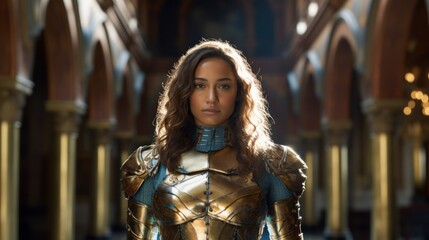 Superhero woman with blonde ponytail, red cape, and determined pose against cloudy sky
