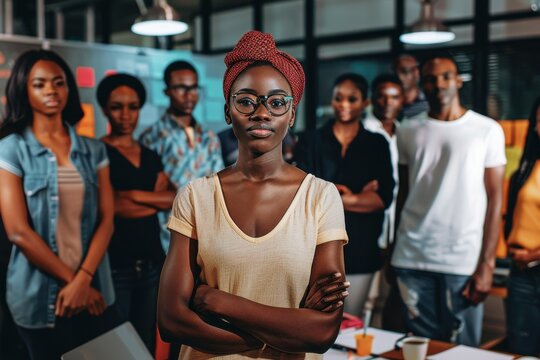 African woman standing out in front of the group Business development concept and teamwork in new start-up company in South East Asia with ethnically and age diverse business people