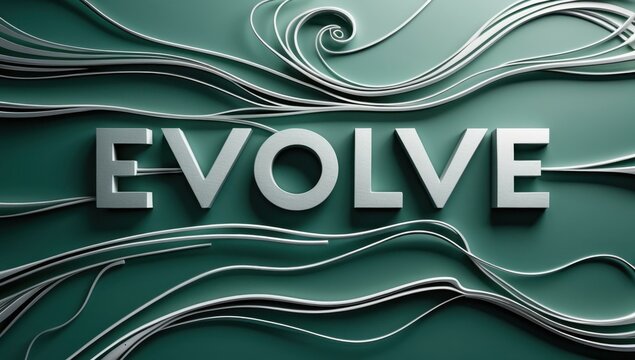 3D metallic silver evolve text with abstract swirling lines, representing growth and transformation, ideal for business, innovation, motivational themes, dark teal background, modern and dynamic styl