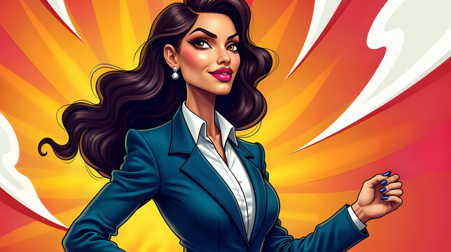 A Dynamic and Colorful Caricature of an Empowered Businesswoman with Striking Features Emphasizing Confidence