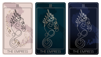 The Empress. A card of Major arcana one line drawing tarot cards. Tarot deck. Vector linear hand drawn illustration with occult, mystical and esoteric symbols. 3 colors. Proposional to 2,75x4,75 in.