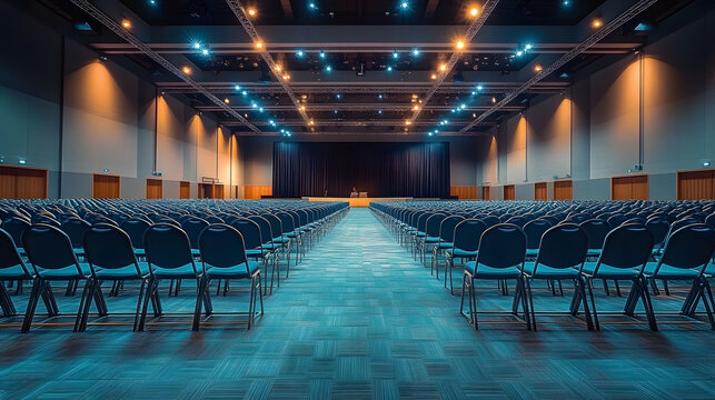 Empty conference room with rows of chairs and stage. Large meeting hall prepared for seminar or presentation event.