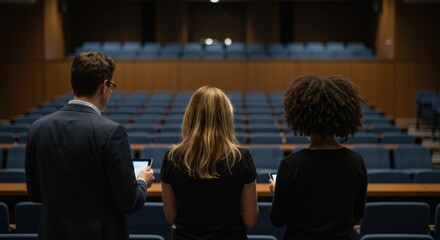 Three people, a man and two women, stand at the front of an empty auditorium, holding devices and facing the rows of blue seats, possibly preparing for a presentation or event