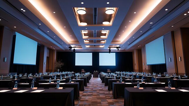 Modern conference room prepared for a meeting, with rows of tables, chairs, water bottles, and projection screens.