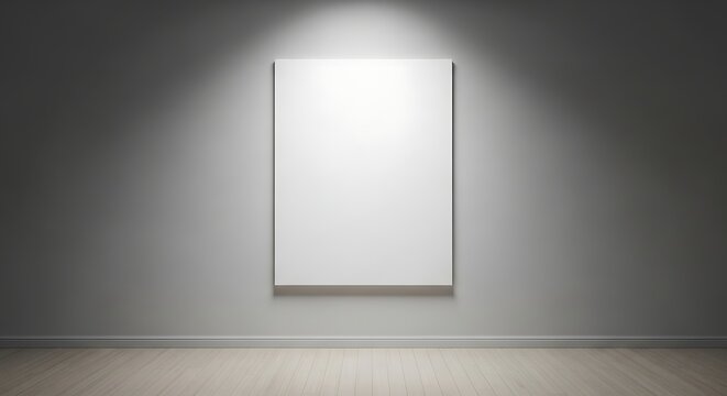 White canvas, blank picture mockup hanging on beige wall with dark shadows of leaves. Poster mockup, empty canvas with shadows of plant, side view
