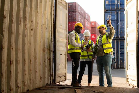 Group of workers in an empty container storage yard, The condition of the old container is being assessed to determine whether it requires maintenance for usage.