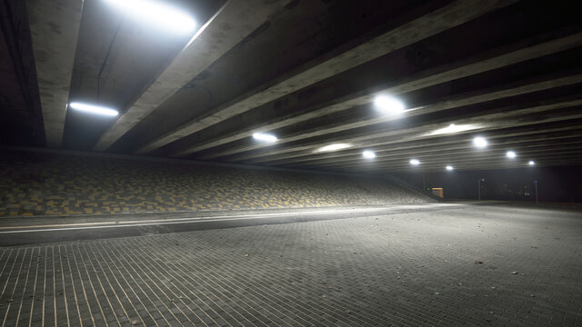 An empty illuminated motorway, bicycle road and pedestrian walkway under the bridge in a fog at night. Dark urban scene. Riga, Latvia. Dangerous driving, concept image
