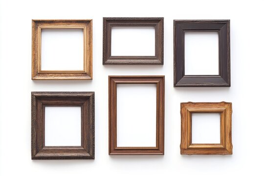 Assorted empty wooden picture frames on white background