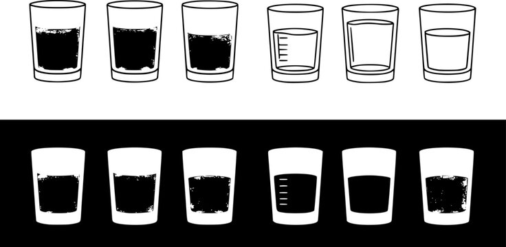 Water glass icon vector set in blue and back flat outline. Drink glass line pictogram. Water glass vector icon set. tall full, half and empty milk or water glass sign.