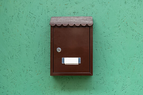 Hand getting out a letter from wooden mailbox. Opening a mailbox receiving an envelope letter, closes a mailbox with a key, handheld close up shot