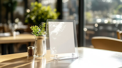 White label mockup for empty menu frame in store or beauty salon with plant flower Stand booklet paper tent card sheets on the reception desk displays your product background