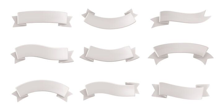 Curved ribbon 3D banner. Blank waving label, retro text frame for emblem, badge or title tag designs. Realistic white fabric scroll ribbons, isolated decoration templates vector set.