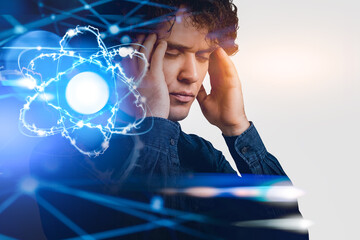 Cyberspace and mind uploading concept. High Speed Connection and Data Analysis Technology, Abstract hud. Businessman holding his head, brain scanning process to create emulation of mental state