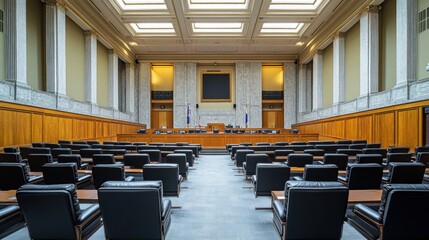 A legislative hall with modern chairs and a spacious, open floor plan. Featuring efficiency and accessibility