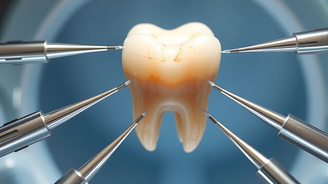 Dental tools in protective circle around aging tooth under clinical light