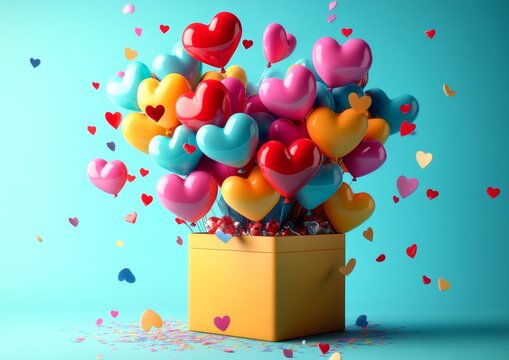 Colorful Heart Balloons Fly from a Gift Box Surprise Celebration