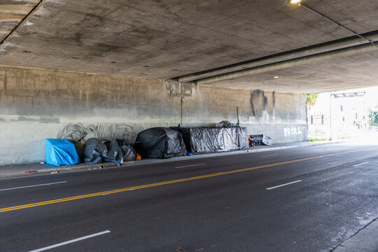 A homeless encampment under a freeway overpass in Los Angeles California USA