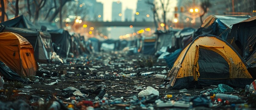 Homeless encampment in a city environment filled with trash, highlighting poverty, urban struggle, and social issues 8K , high-resolution, ultra HD,up32K HD