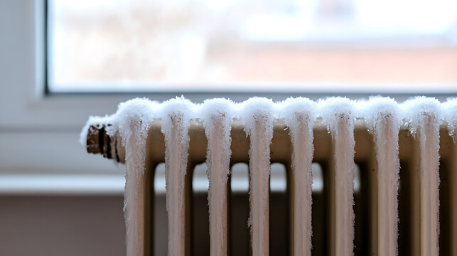 A chilling image of a radiator encased in snow, juxtaposed against a blurred window backdrop. Evokes the stark beauty of winter's icy grip on everyday objects.