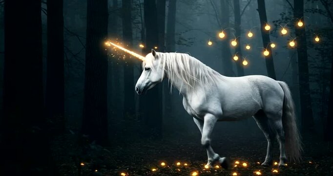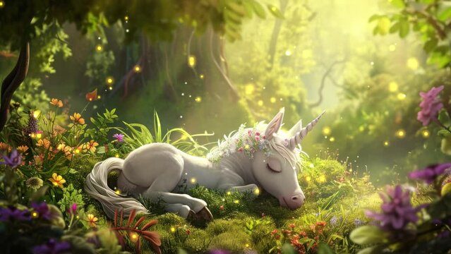A sweet young unicorn lies dreaming in a forest, illuminated by glowing yellow and white fireflies, loop animation