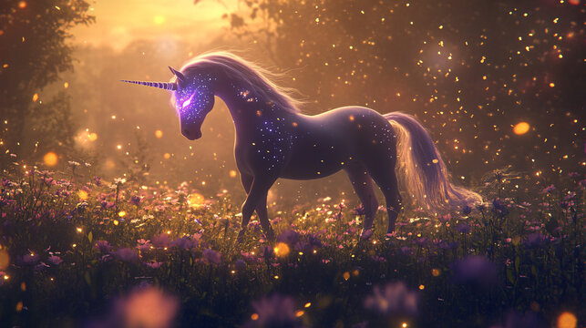 A glowing purple unicorn standing in a field of enchanted flowers, surrounded by mist and sparkling lights.
