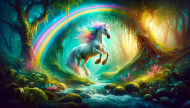 Description: A unicorn leaping across a rainbow in a magical forest setting.