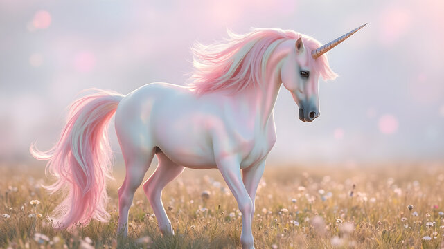 A majestic unicorn standing gracefully, with a shimmering horn and flowing mane, symbolizing purity and magic