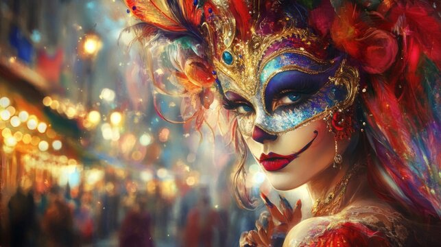 Vibrant jester wearing a colorful hat with bells during a lively festival celebration in an enchanting street