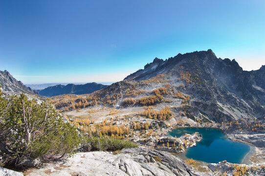 Sunlit alpine forest, clear lake and granite mountain. Leprechaun lake. The Enchantments. Cascade Mountains. Seattle. Leavenworth. WA. United States.