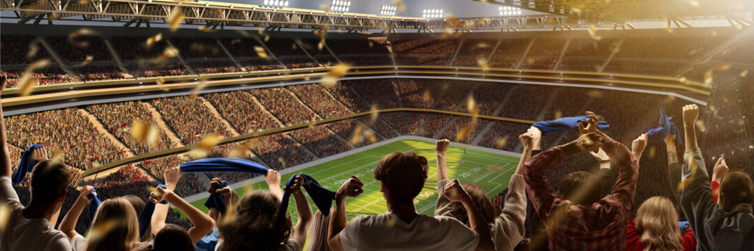 Group of emotional people, football fans cheering up favorite soccer team during live championship at crowded open air stadium. Concept of competition, leisure time, emotions, live sport event