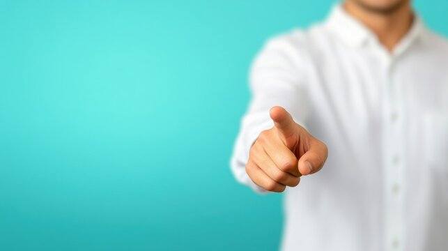 Young man in navy shirt points finger at camera in studio with blue backdrop, smiling and making eye contact; confidence.