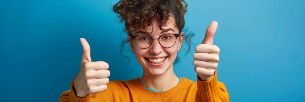 Cheerful young woman giving a thumbs up gesture in an office setting, reflecting positivity and confidence with a warm smile and bright background