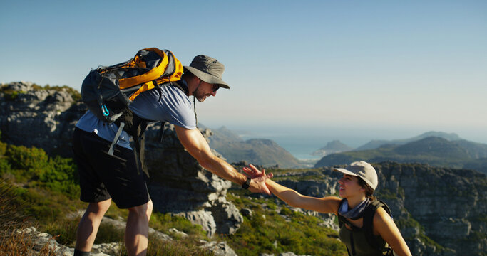 Couple, hiking or helping hand with support on mountain for trekking journey or adventure in nature. Man, woman or hikers with smile, backpack or teamwork for aid, assistance or exploration together
