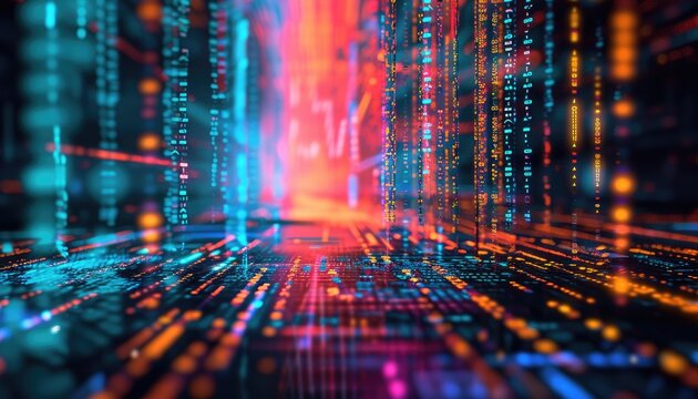 High-definition photo of a science-themed digital code matrix, featuring a complex web of data streams and bright codes floating in a dark virtual space