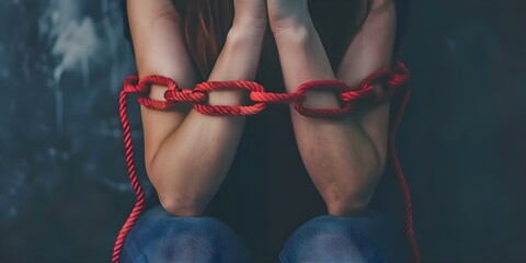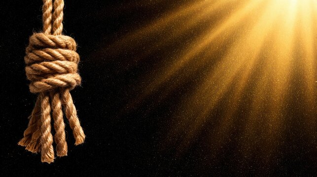 Human Trafficking Awareness day A thick brown rope knot hangs vertically illuminated by dramatic golden light rays on a dark field End Human Trafficking